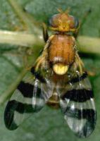 Die Larven der Fliegen entwickeln sich in den Früchten verschiedener Walnussgewächse. In Nordamerika werden u. a. Schwarznuss, Juglans californica und Juglans hindsii befallen. In Europa wird insbesondere die Echte Walnuss (Juglans reg/a) befallen. Selten werden auch Pfirsiche befallen.